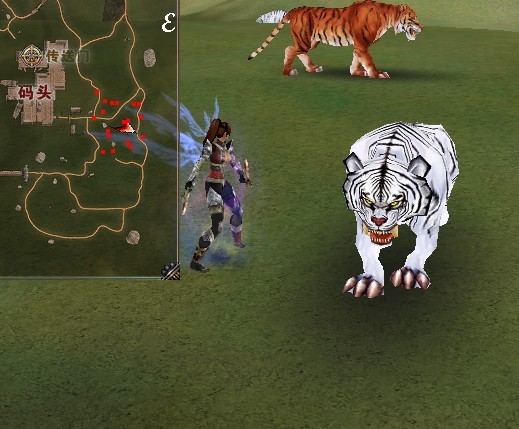 在这,玄引居然直接小瞧我,说我肯定不行的。不就是打150只老虎嘛,没问题。虽然数量是有点大,但是还是要努力向玄引索要我的第四个称号。老虎从龙城传送到码头就可以看到很多。这个老虎和K5-2这个版本里的坐骑老虎长的一样啊!还是很有王者风范的。