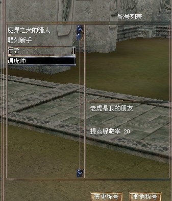 照样打完BOSS,回去找玄引。看他怎么说。不管他怎么说,还是要把这第四个称号拿给我了。“训虎师”——提高躲避率 20。为下一个称号奋斗……